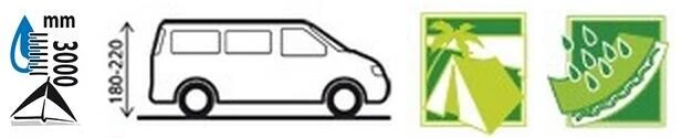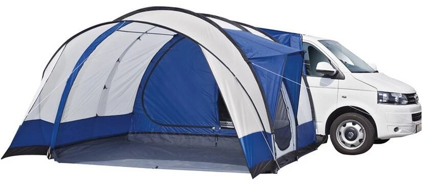 Modernes, freistehendes Busvorzelt mit abnehmbarer Vorderwand und seitlichem Eingang mit Regendach. Rundum-Schmutzstreifen. Das Zeltinnere bietet viel Platz bei hervorragender Belüftung. Alle Fenster verfügen über Abdeckungen die vor ungewünschtem Lichteinfall oder indiskreten Blicken schützen. Die Rückwand ist verschließbar. Einfache Montage.
