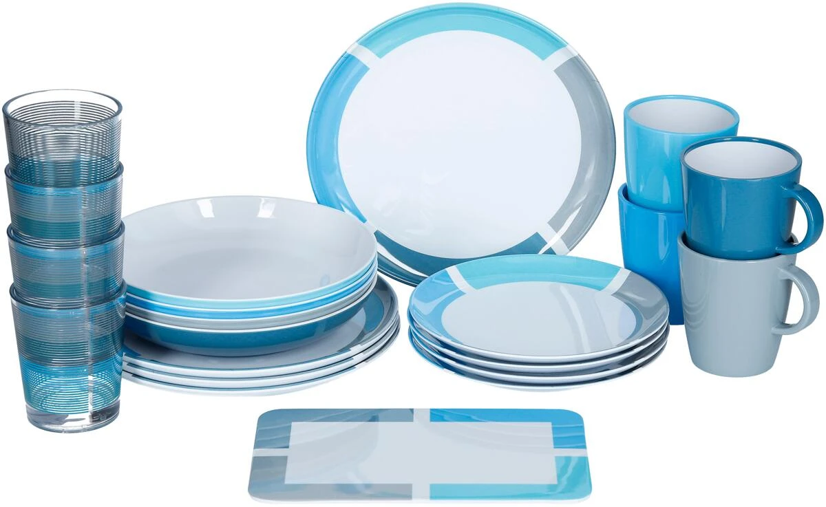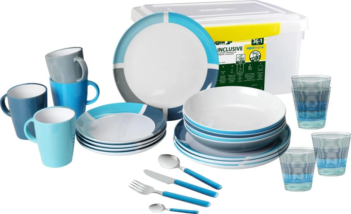 36-teiliges Geschirr-Komplettset aus Melamin mit Transportbox. Alle Teile mit Antislip System.