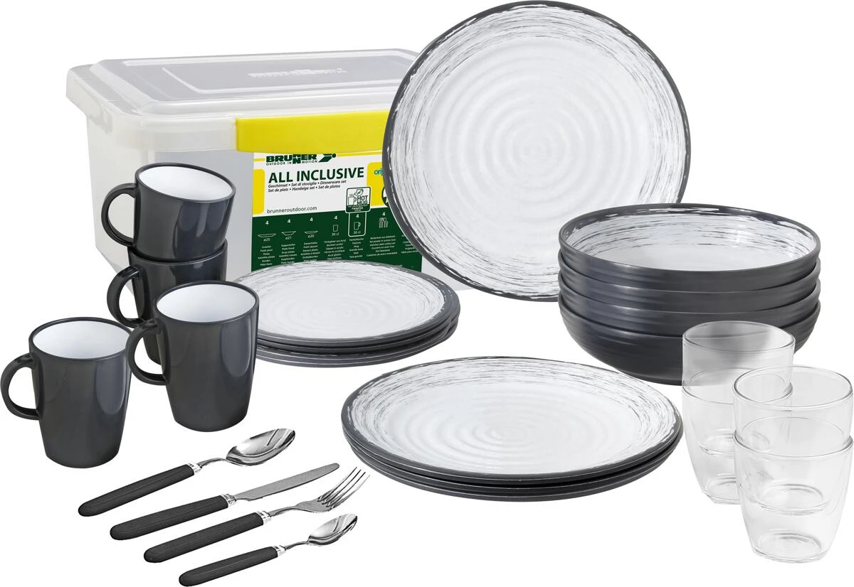Mit dieser Geschirrserie sind Sie für jede Mahlzeit ausgestattet. Das All-inclusive-Geschirrset mit 36 Teilen und Transportbox bietet alles was man für 4 Personen benötigt.