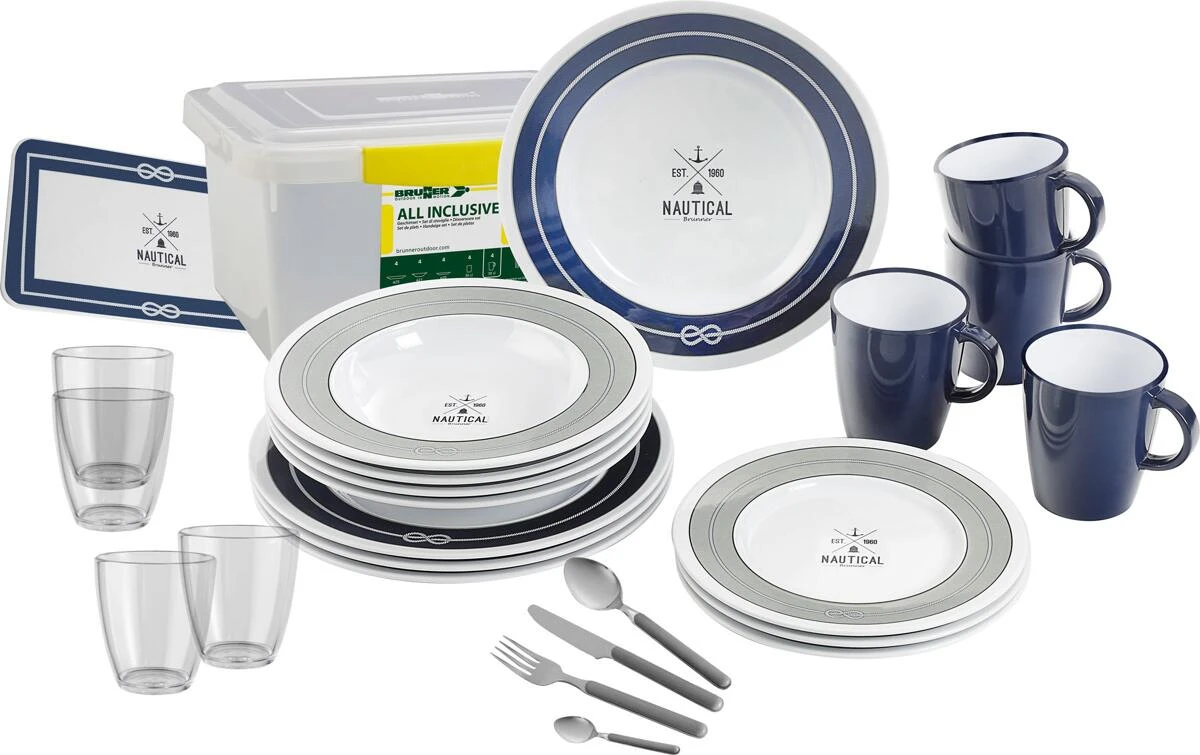 36-teiliges Geschirr-Komplettset aus Melamin mit Transportbox. Alle Teile mit Antislip System.