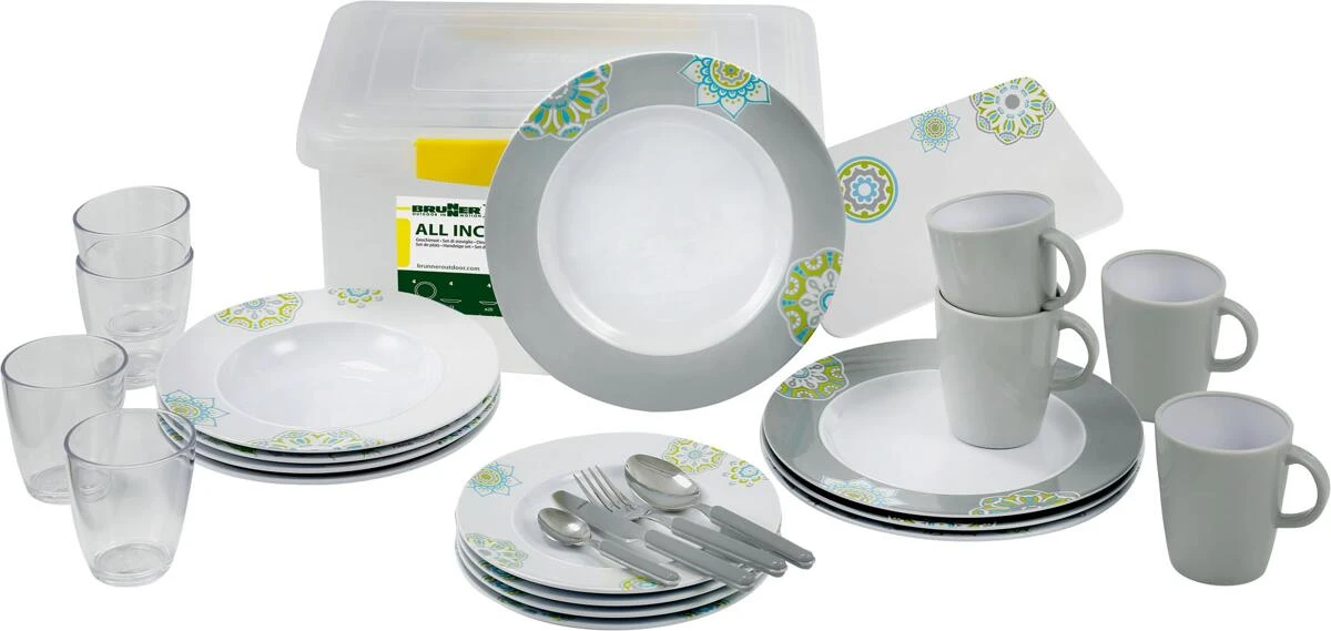 36-teiliges Geschirr-Komplettset aus Melamin mit Transportbox. Alle Teile mit Antislip System.