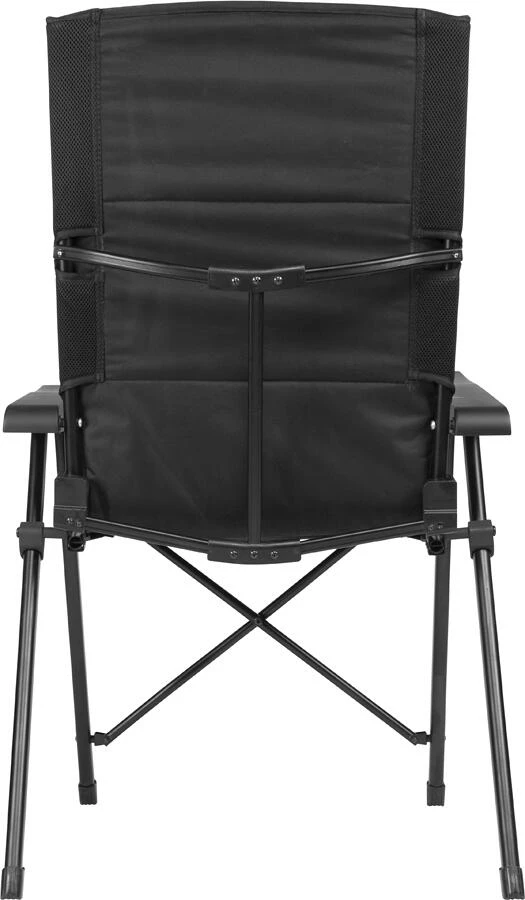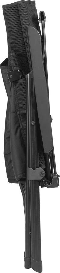 Praktischer Klappstuhl mit hoher, verstellbarer Rückenlehne, Seitenstreben und bequemen Armlehnen für ein hohes Maß an Komfort bei gleichzeitig sehr kompakten Transportmaßen. Das strapazierfähige Polyestergewebe und die vorderen Füße, die ein Einsinken verhindern, vervollständigen die hohe Funktionalität des Stuhls. Mit Tragetasche.