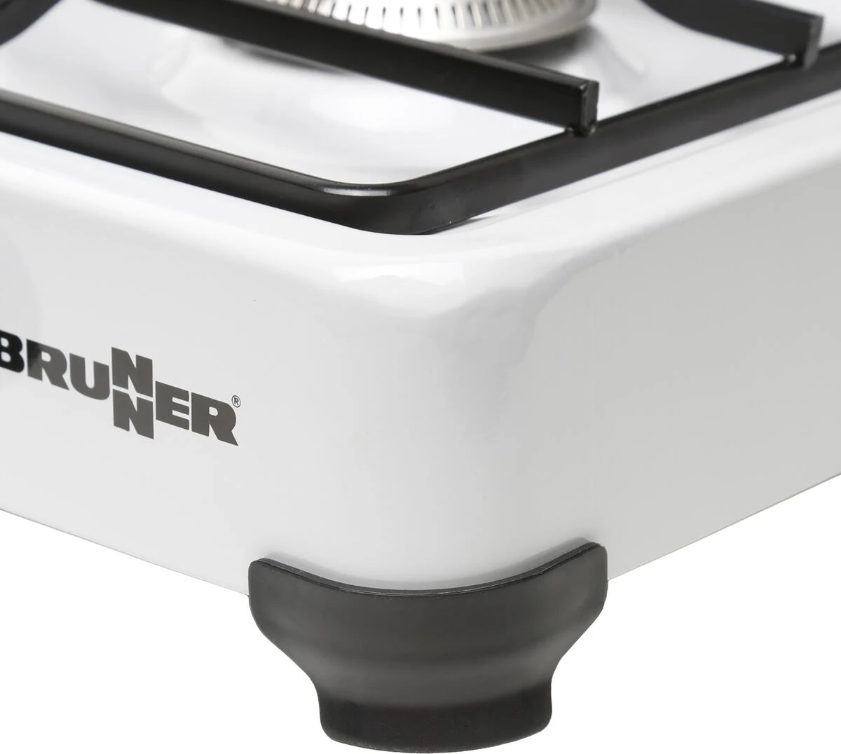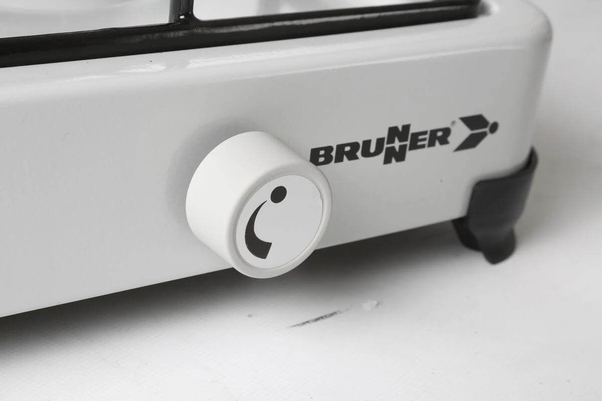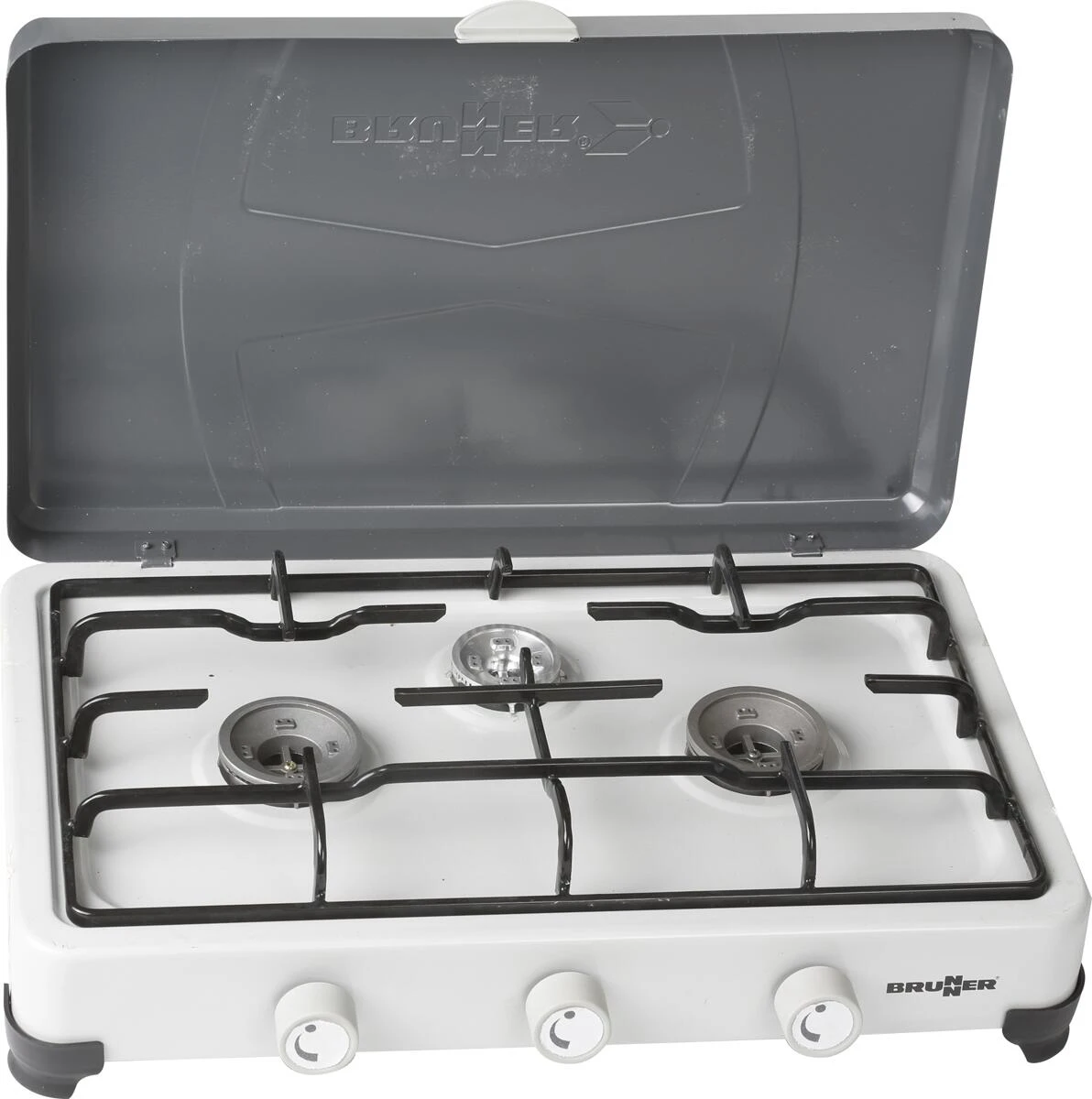 Dreiflamm-Gaskocher mit pulverbeschichtetem Metallgehäuse und Deckel. Alle Kochstellen sind separat stufenlos regelbar.
