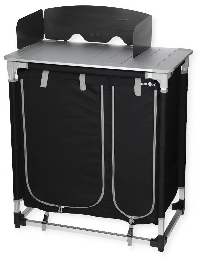 Ein vormontiertes Rahmengestänge aus Aluminium, auf das ein hochwertiger Bezug aus widerstandsfähigem Polyester aufgezogen wird, bildet das Gerüst für die in Anthrazit gehaltenen Schränke. Die abriebfesten, aus Ripstop Polyester gefertigten Gestängekanäle des Bezugs, in dem rückseitig eine Lüftungsgaze eingearbeitet ist, sorgen für schnellen Auf- und Abbau, die Ablageböden werden einfach eingelegt. Alle Drehteller-Füße sind höhenverstellbar und sorgen auch auf unebenem Untergrund für sicheren Stand. Den oberen Abschluss der stabilen Konstruktion bildet eine Ablageplatte. Eine praktische Trage- und Aufbewahrungstasche gehört zum Lieferumfang.