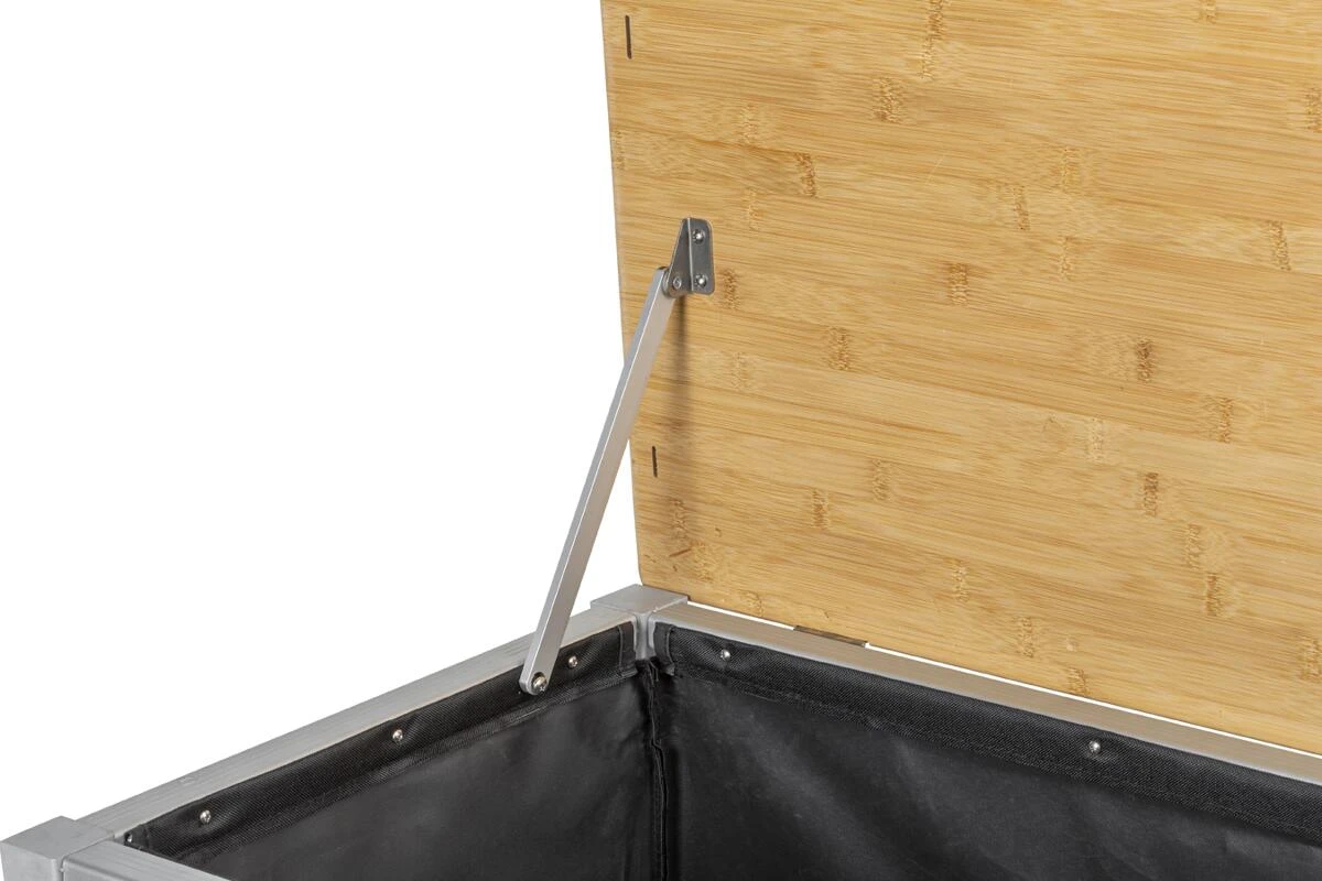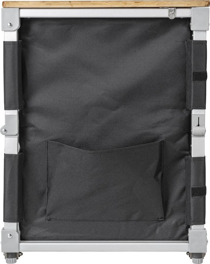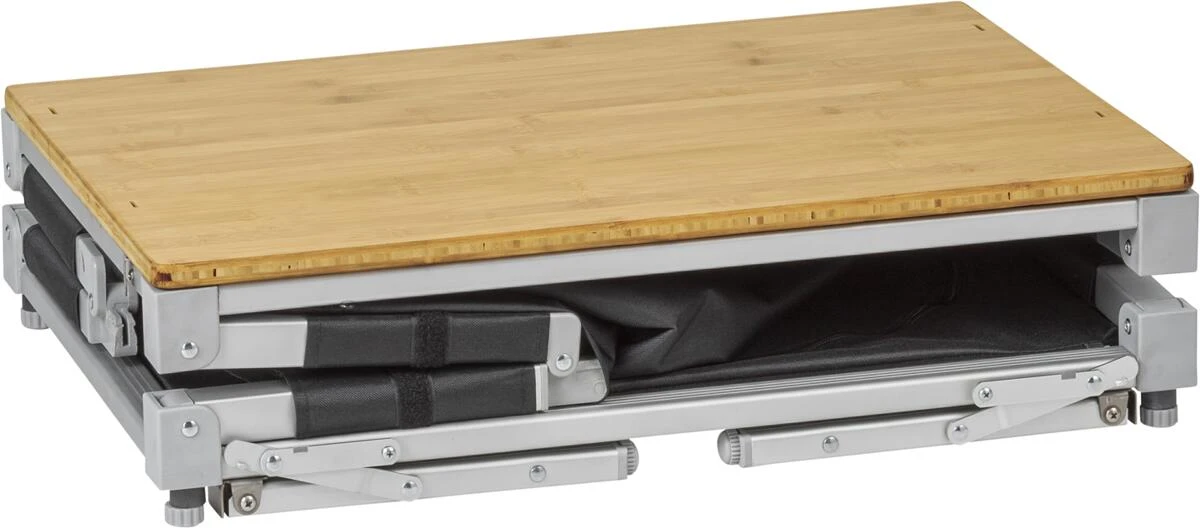 Tragbarer, klappbarer Küchenschrank mit völlig neuer, platzsparender Mountless-Aluminiumkonstruktion. Im Handumdrehen zu öffnen und zu schließen. Kochfläche aus Bambusholz. Komplett mit Stoffschrank zur Aufbewahrung des gesamten Kochzubehörs. Im zusammengeklappten Zustand sehr kompakt verstaubar und daher ideal für alle Kleinbusse, Vans und Wohnmobile. Komplett mit Aufbewahrungstasche.