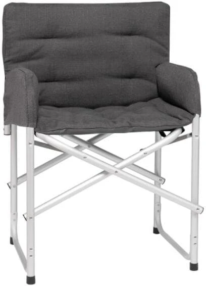 Hochkomfortabler Alu-Regiestuhl mit wetterfestem Syntex-Bezug, lackiertem, klappbarem Sicherheitsgerüst, gepolsterten Armlehnen und abnehmbarem, gepolstertem Polyesterbezug.