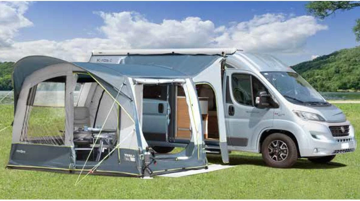 Freistehendes Buszelt mit aufblasbarem A.I.R. Tech Luftgerüst (2 Bögen). Verbindungsschleuse mit direktem Zugang zum Fahrzeug.