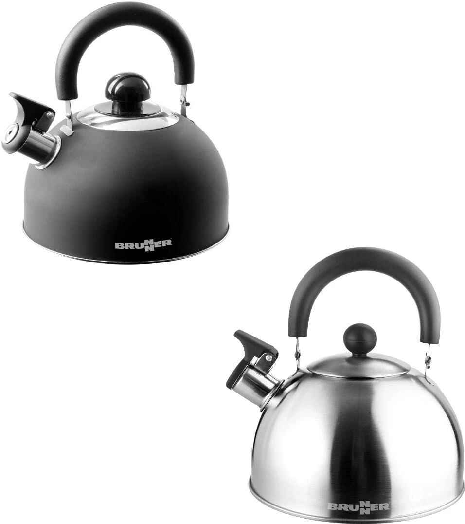 Formschöner Flötenkessel aus Edelstahl mit induktionsgeeignetem Topfboden und rutschfesten, gummierten Griffen. Elegantes Design.