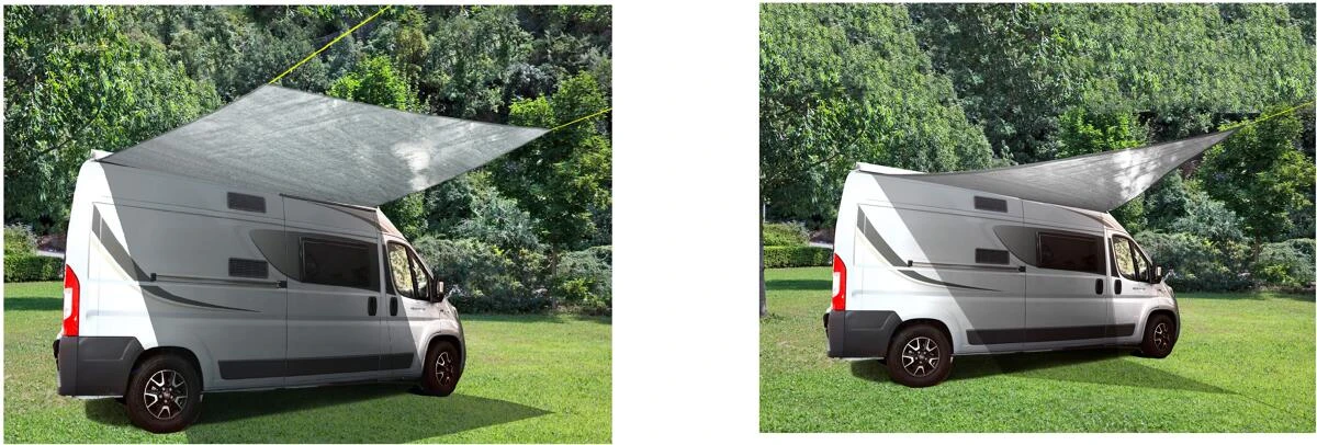 Komfortable Sonnensegel aus UV-beständigem Kunstgewebe. Rundum gesäumt, mit Ösen. Einfache Montage an der Kederleiste von Wohnwägen, Wohnmobilen, Kastenwägen oder Bussen. Geeignet für Fiamma-, Thule- und Omnistor-Markisen.