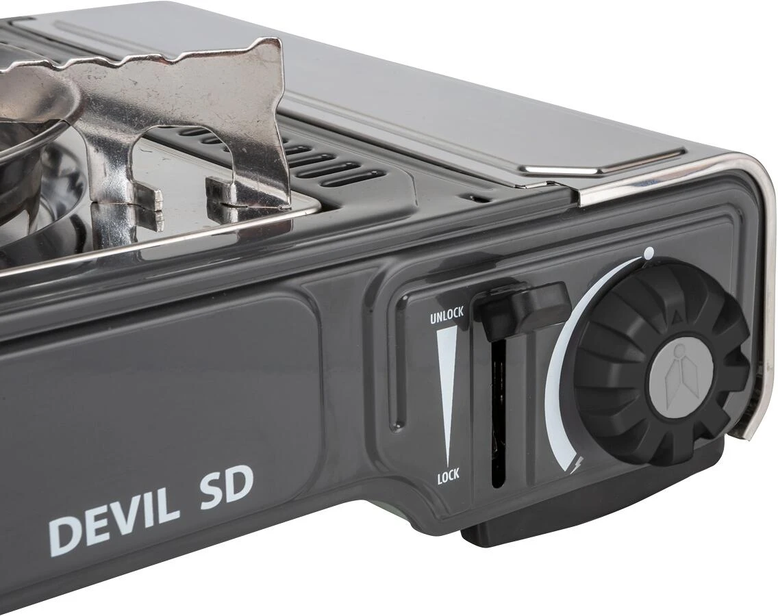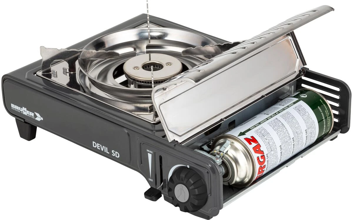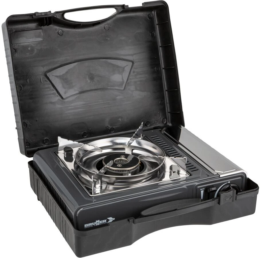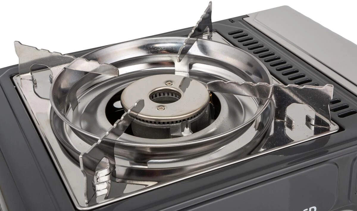Tragbarer Gaskartuschenkocher mit Flammen-Einstellknopf, integrierter Piezo-Zündung und Zündsicherungs-Thermoelement. Die Topfauflageplatte und die Kartuschenabdeckung bestehen aus langlebigem, pflegeleichtem Edelstahl. Optimale Leistungsabgabe durch einen speziellen Zweiflammenbrenner.