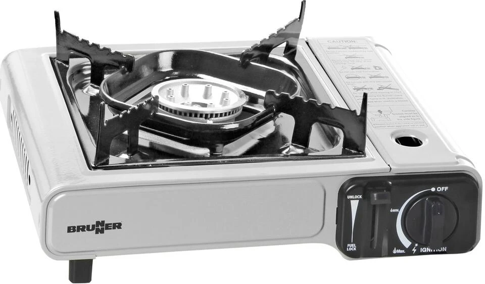 1-flammiger Kartuschen-Gaskocher mit integrierter Piezozündung und Alu-Brenner.