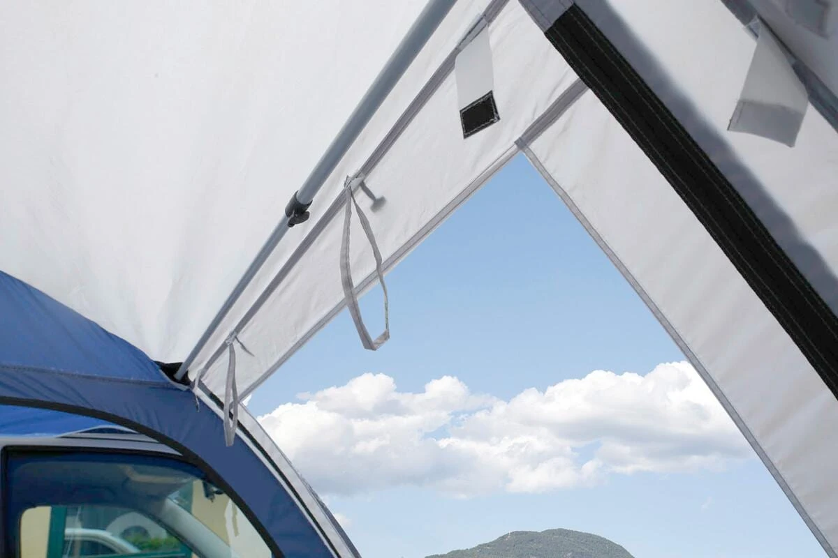 Kompaktes Busvorzelt, das sich bestens zum Anschluss an Campingbusse mit einer Regenrinnenhöhe von 180 – 220 cm eignet. Einfacher, aufwandloser Aufbau. Freistehend. Ideal um den Wohnkomfort des Busses durch zusätzlichen Freiraum zu steigern. Vorder- und Seiteneingang sind aufstellbar. Große KlarsichFenster vermitteln ein positives Raumgefühl und erlauben einen ungestörten Blick nach außen.