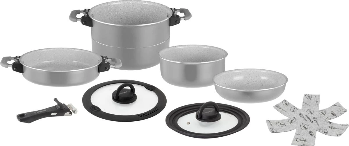 Das Fusion Magnetic Ceramic Kochtopf-Set im schlichten Design mit pattentierter Magnet Funktion, genannt MAGNETOGRIP SYSTEM. Ein Neu entwickeltes Griff- und Verbindungssystem, das durch die Verwendung von abklappbaren Griffen mit integriertem Magnetelement eine deutliche Verringerung des Packmaßes der Topfsets ermöglicht und zudem die Verwendung eines Zurrgurtes zur Stabilisierung von Topf und Pfanne während des Transportes unnötig macht.