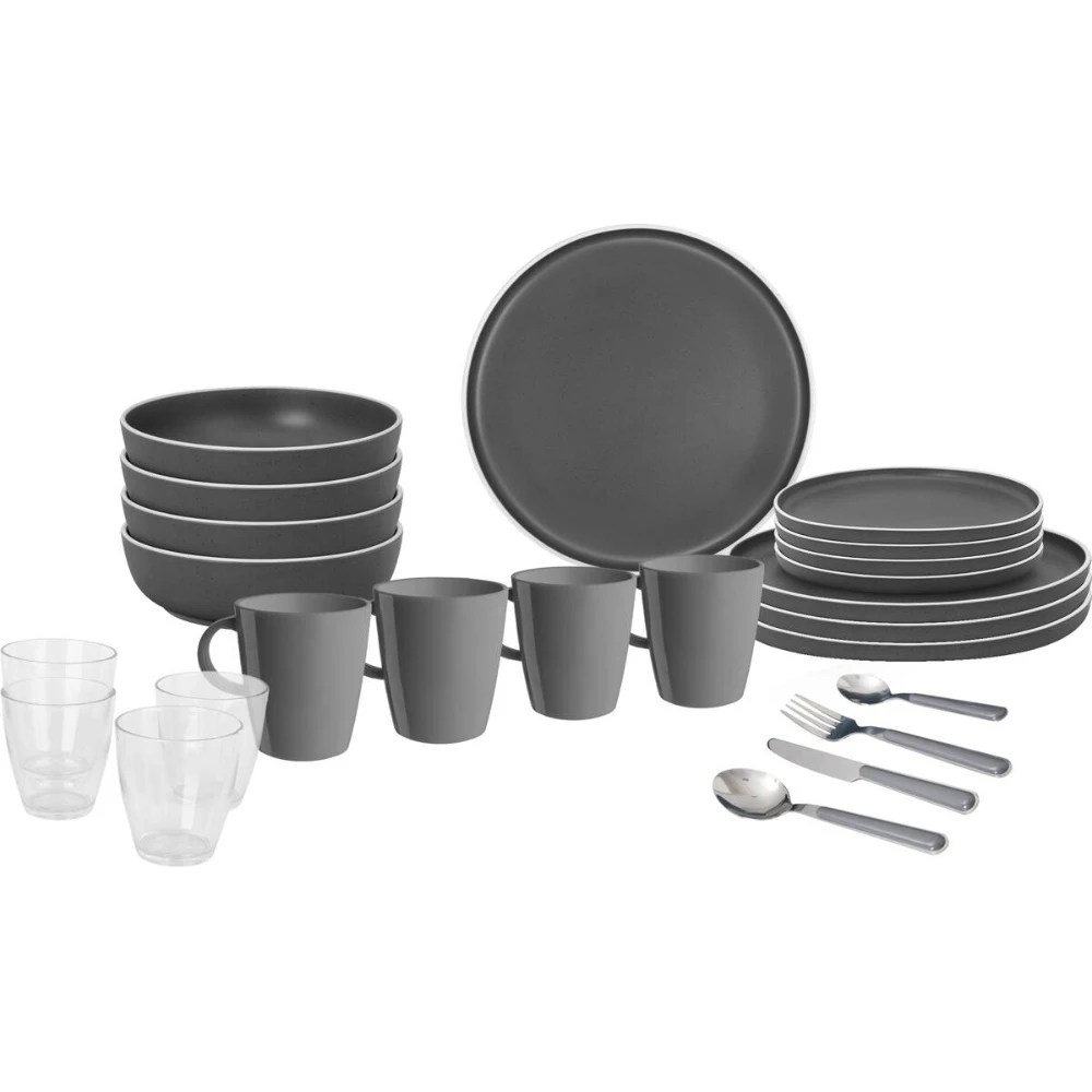 Mit dieser Geschirrserie sind Sie für jede Mahlzeit ausgestattet. Das All Inclusive-Geschirrset mit 36 Teilen und Transportbox bietet alles was man für 4 Personen benötigt. Das neu entwickelte Stone Touch Geschirr aus einem Melamin-Mineralgemisch hat hervorragende funktionelle Eigenschaften. Die Becher sind aus Resylin, ein farbloser Thermoplast auf ABS-Basis (Acrylnitrilbutadienstyrol), bei dem sich gute mechanische Eigenschaften mit einer guten Chemikalienbeständigkeit verbinden. 100% BPA-frei und lebensmittelecht mit ausgezeichneten Isolationseigenschaften.