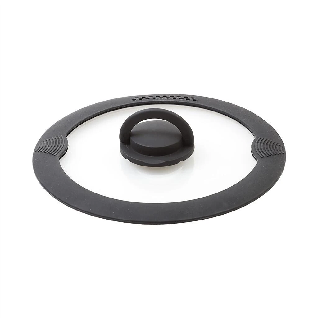 Glasdeckel mit Silikon-Lärmschutzrand mit Sieböffnung und Schlitz zur Befestigung der Griffzangen.