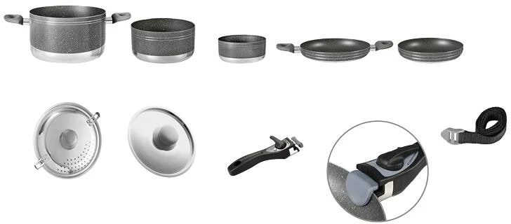 Elegantes und platzsparendes Topfset aus Aluminium. Mit Antihaft-Beschichtung.