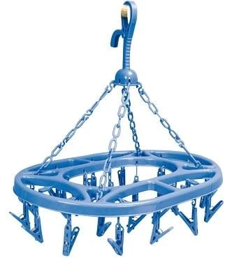Wäschespinne aus hochwertigem Kunststoff, ovale Form mit 24 Klammern. Befestigungshaken mit Federverschluss.