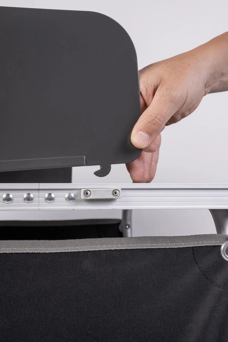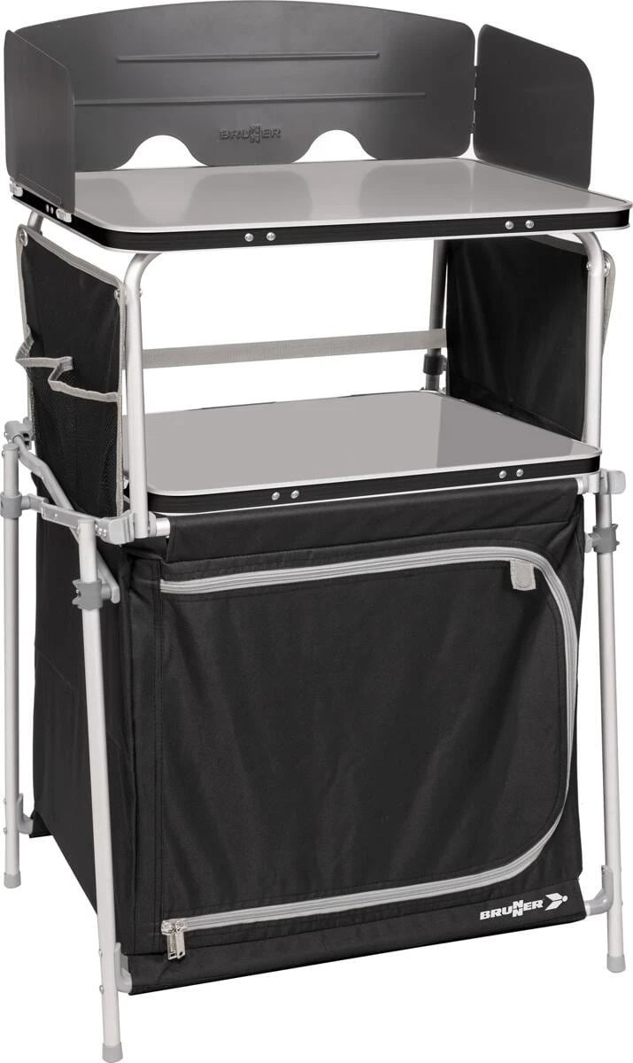 Diese kompakt faltbare Kochbox mit hitzebeständiger Arbeitsplatte, bietet viel Stauraum, hat seitliche Utensilientaschen und einen praktischen Wind- und Spritzschutz aus Metall. Sie ist ideal für kleinere Caravan- und Busvorzelte.