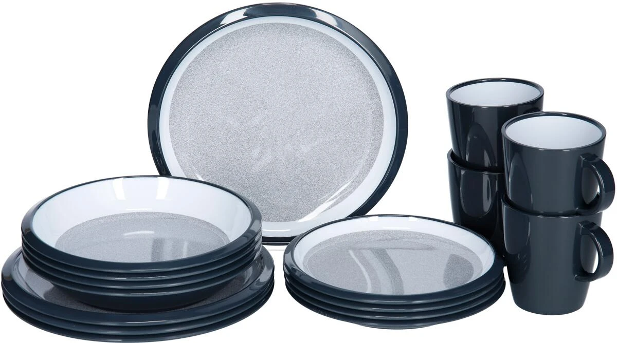 16-teiliges Set bestehend aus 4 Esstellern ø24,5 cm, 4 Suppentellern ø21,5 cm, 4 Desserttellern ø19,5 cm und 4 Henkelbechern 0,3 L. Mit Anti-Slip Dichtungen um das Verrutschen im Wohnmobil zu verhindern.