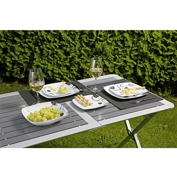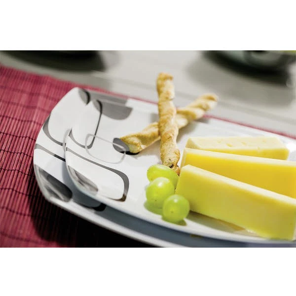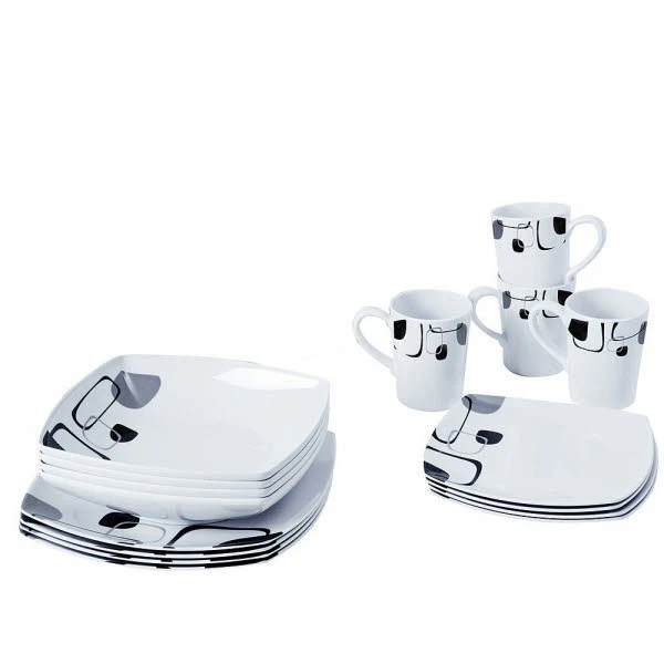 Innovatives 16-teiliges Geschirrset aus hochwertigem Melamin. Ansprechendes Dessin und quadratische Form.