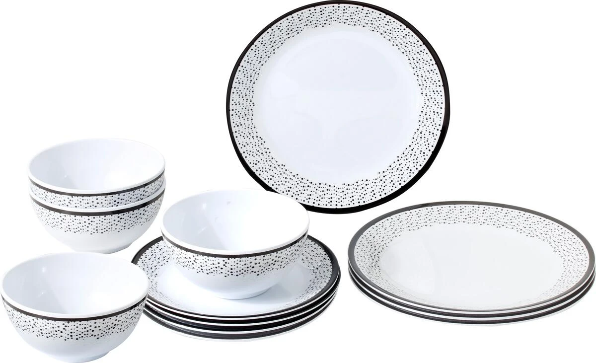 12-teiliges Geschirrset aus hochwertigem Melamin. Alle Teile mit Antislip System.