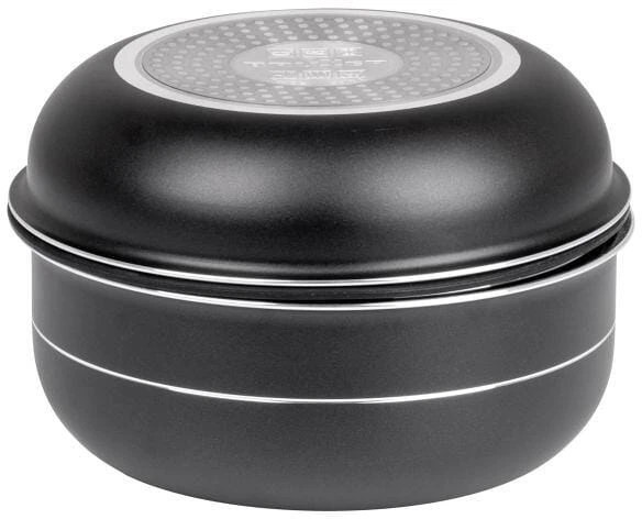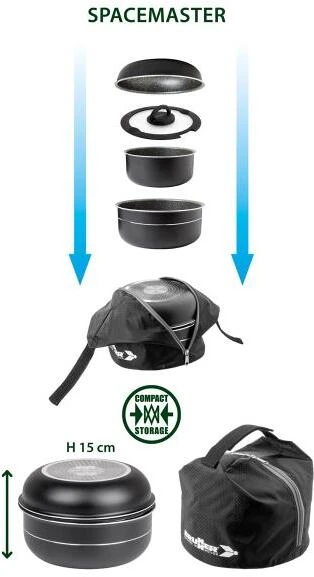 Topfset-Kollektion aus Aluminium mit hochwertiger Antihaft-Beschichtung. Kompakt verstaubar, modernes Design, hygienisch, zuverlässig, unempfindlich gegenüber Temperaturschocks und korrosionsfest. Das neue Vacublock-System sichert Ihre Töpfe und Pfannen während der Fahrt und ich die perfekte Lösung für Freizeitfahrzeuge und Boote.