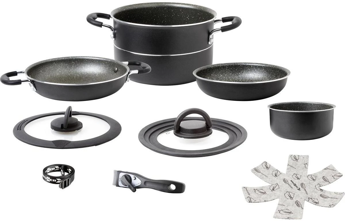 Topfset-Kollektion aus Aluminium mit hochwertiger Antihaft-Beschichtung. Kompakt verstaubar, modernes Design, hygienisch, zuverlässig, unempfindlich gegenüber Temperaturshocks und korrosionsfest. Das neue Vacublock-System sichert Ihre Töpfe und Pfannen während der Fahrt.