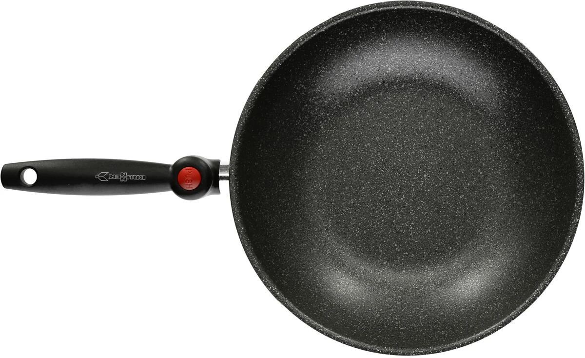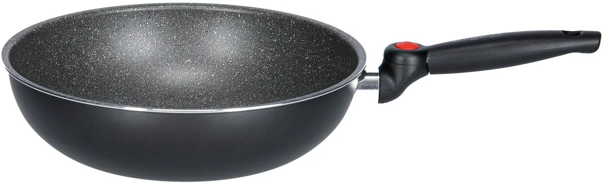 Wok-Pfanne ø 28 cm aus Aluminium mit Antihaft-Beschichtung. Dank patentiertem, klappbarem Griff platzsparend verstaubar.