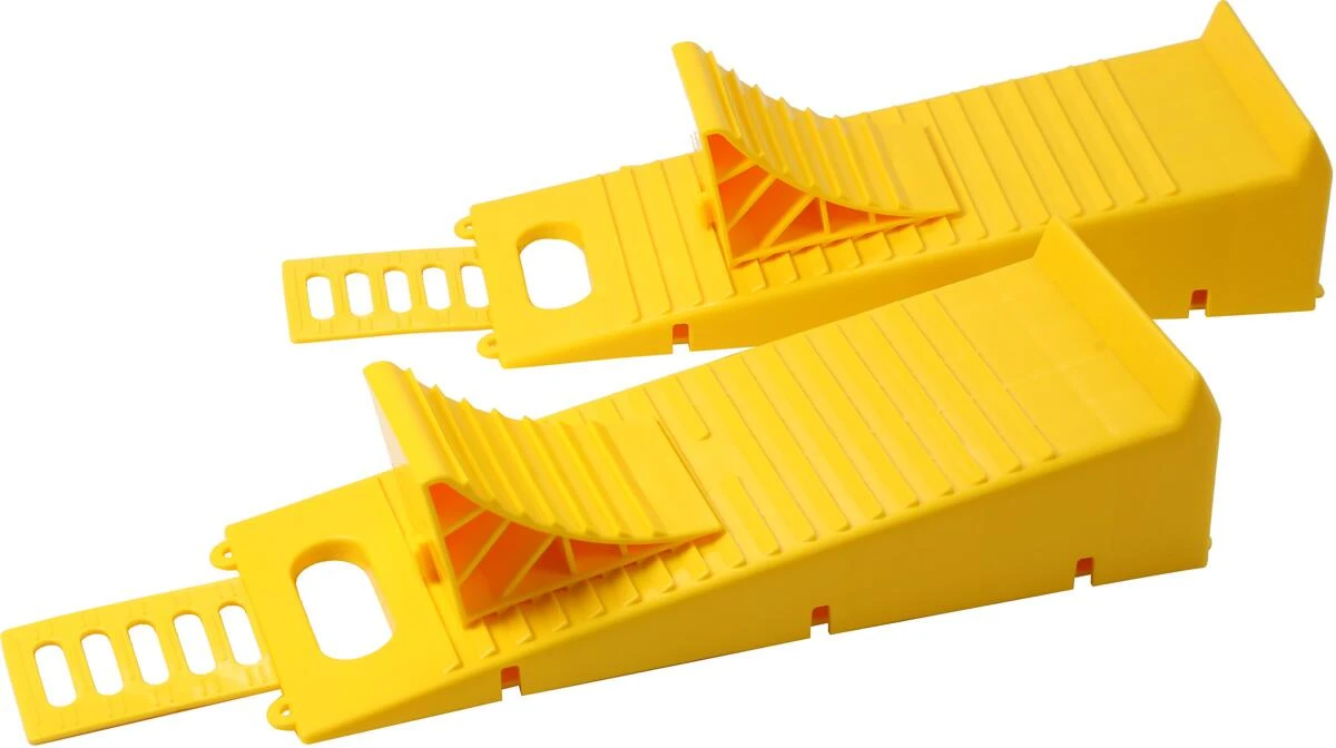 Ausgleichskeil-Set bestehend aus 2 Auffahrkeilen, 2 Blockierkeilen zum Sichern des Fahrzeugs bei längeren Aufenthalten und 2 Antirutschplatten für glatte Böden.