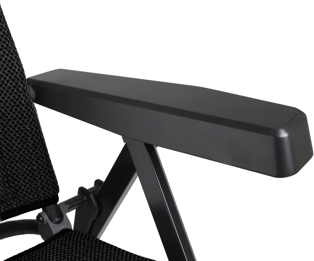 Moderner und platzsparender Campingstuhl mit pulverlackiertem Alu-Gestell, metallverstärkten Armlehnen zur 5-fachen Verstellung der Rückenlehnen und atmungsaktivem Full-3D Bezug.