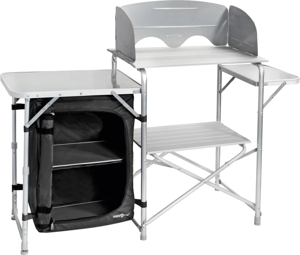 Praktische Kombination aus Feldküche und Geschirrschrank. Stabiles Gestell aus Alu-Hybrid ø 19 mm und großer MDF-Arbeitsplatte mit umlaufendem Aluminium- Rahmen. Der Schrank verfügt über zwei Innenablagen und eine RV-Tür. Einfacher und schneller Aufbau. Inklusive Aufbewahrungstasche (100 % Polyester)