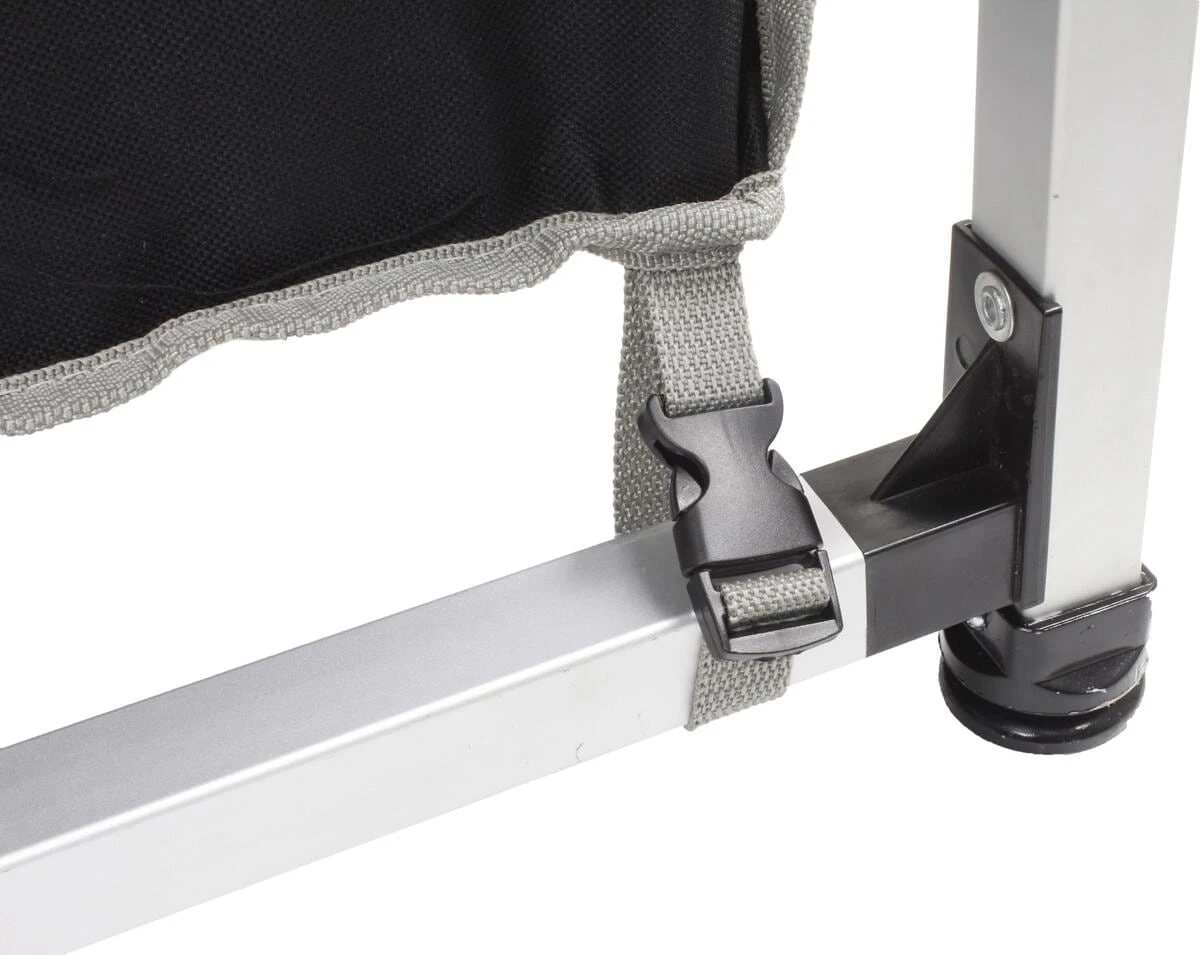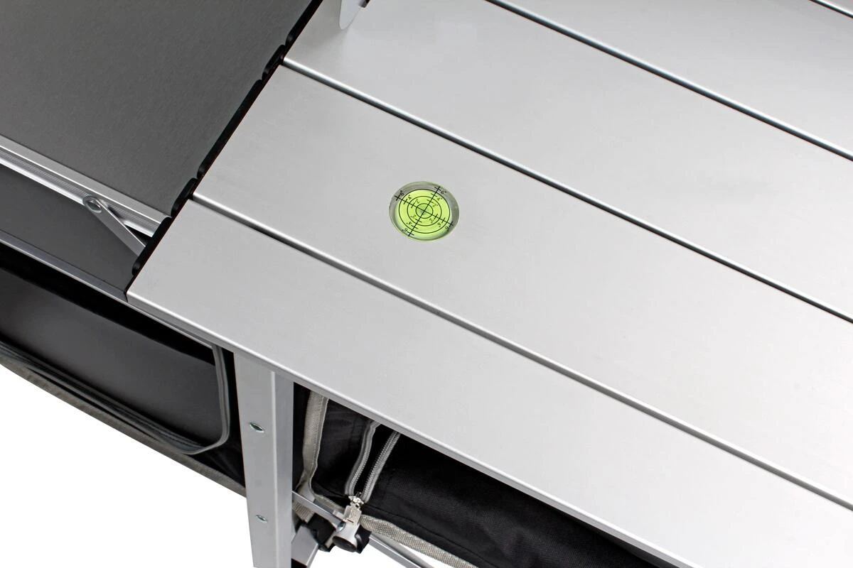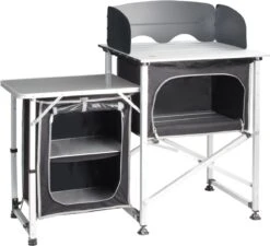 Neu gestaltete Küchenbox mit extra stabiler Klappstruktur aus quadratischem Aluminiumprofil. 2 separate Schränke bieten viel Stauraum für Lebensmittel und Kochgeschirr. Zum Lieferumfang gehören ein Wind- und Spritzschutz sowie eine praktische Tragetasche.