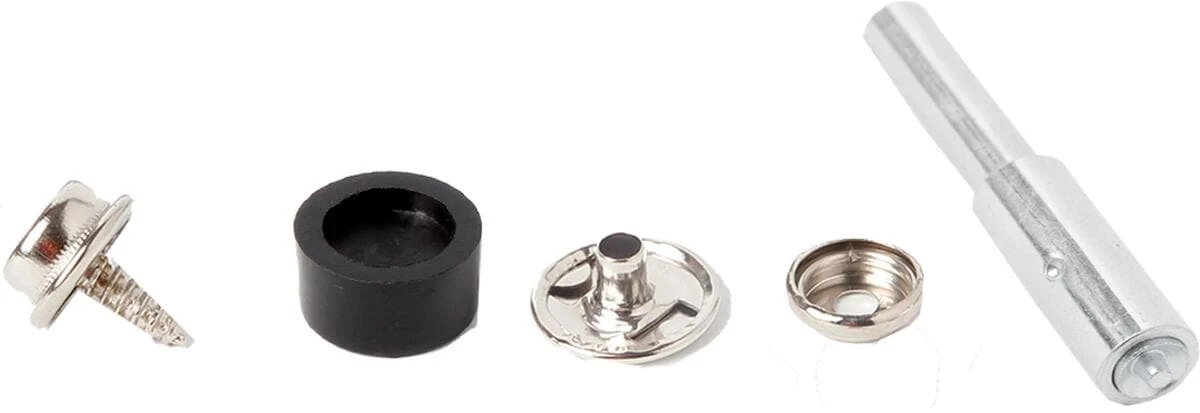 Druckknopf-Set zum Anschrauben, mit komplettem Montagewerkzeug. Im Set sind acht Druckknöpfe aus vernickeltem Metall enthalten.