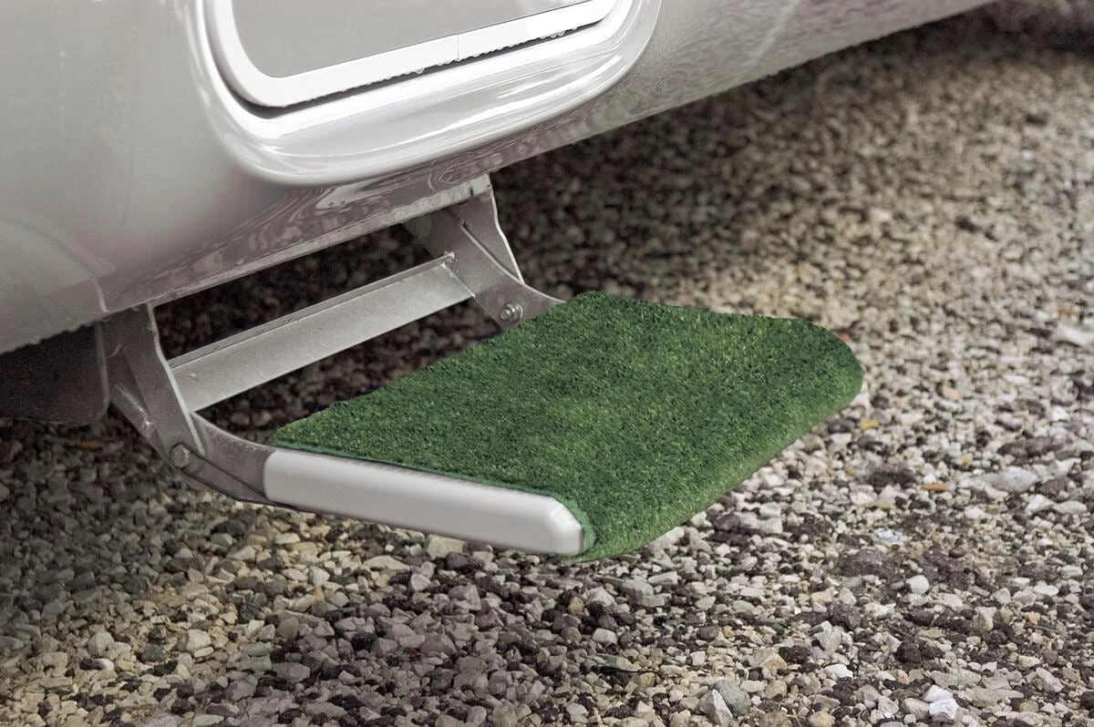 Rutschfester Trittstufenteppich. Einfache und schnelle Befestigung mittels Einhaken zweier Federn in den Ösenlöchern. Geeignet für Trittstufen mit einer Breite von 40 cm und einer einstellbaren Tiefe von 20 oder 25 cm.