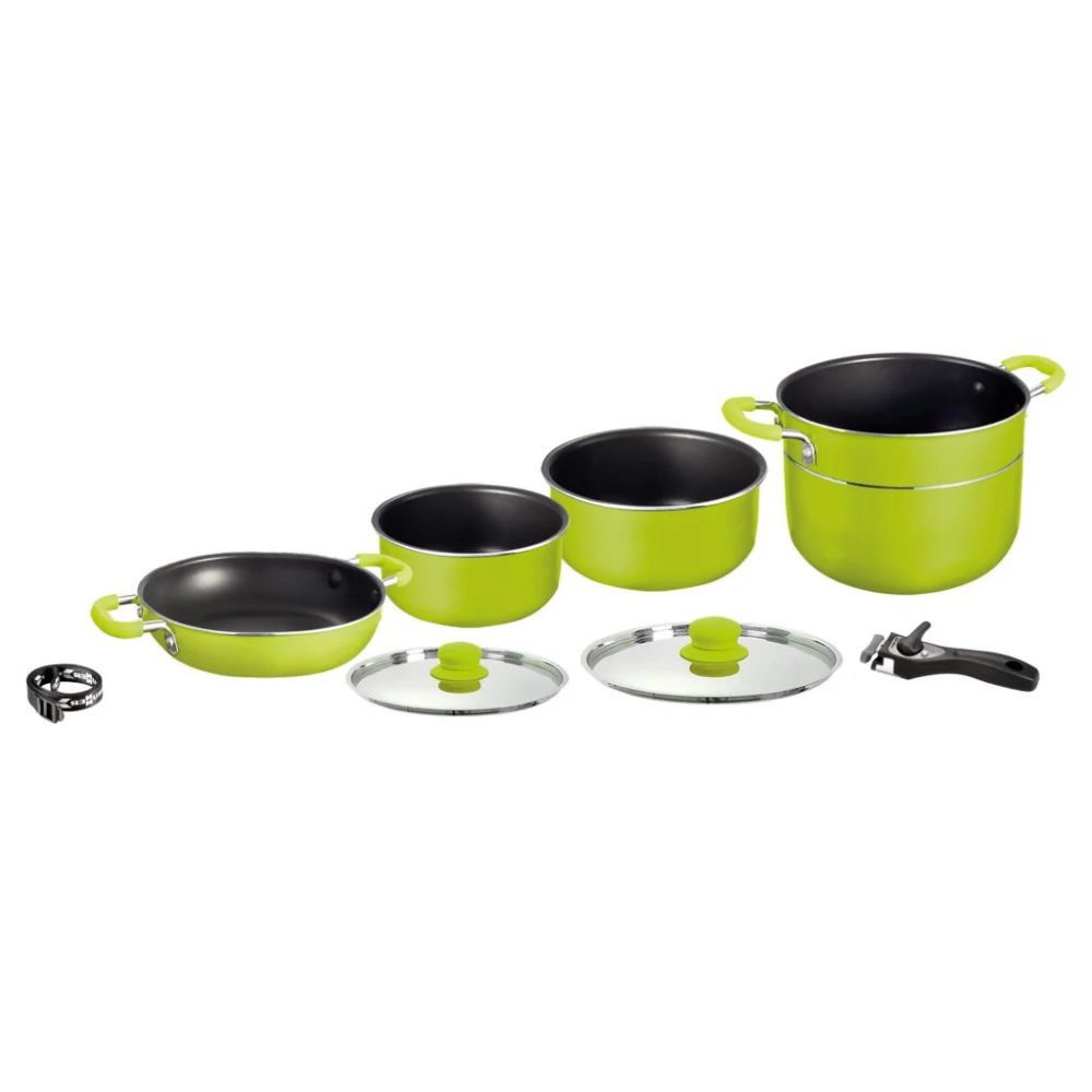 Alu-Topfset mit Edelstahldeckel und Soft-Touch Griffen. Mit Antihaft-Beschichtung.