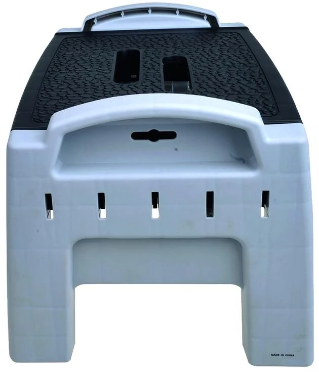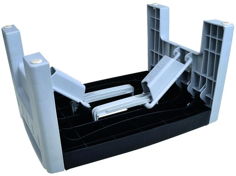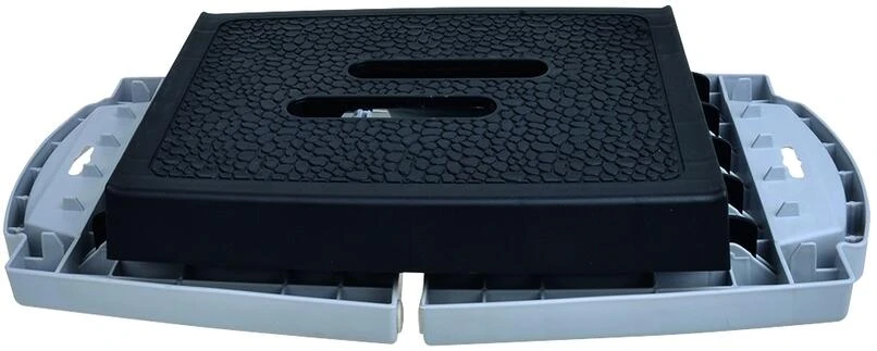 Faltbare Kunststofftrittstufe mit antirutsch-beschichteter Trittauflage. Aus verstärktem Kunststoff.