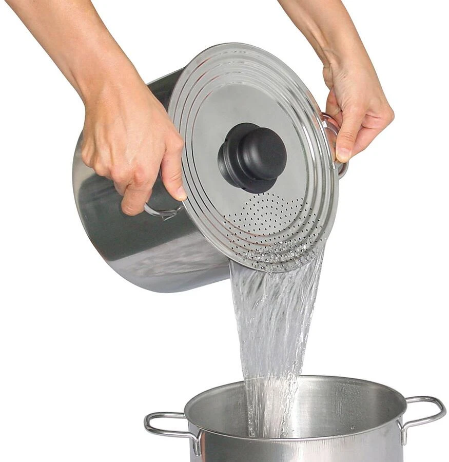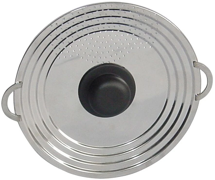 Dank seitlichen Griffen und Dreieckslochung in 2. Funktion als Sieb verwendbar. Edelstahl mit Kunststoffgriff. Passend für Töpfe mit einem Durchmesser von 16 –22 cm.
