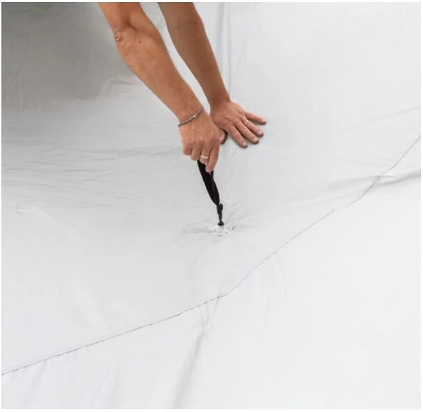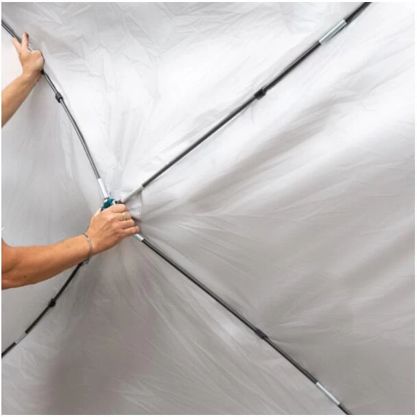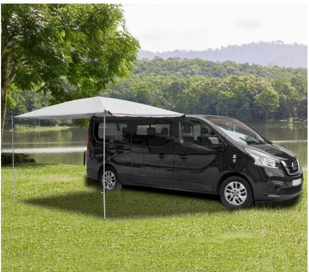 Schnell aufbaubares Sonnendach für Minibusse und Vans mit Fiberglasgerüst, zentraler Stabilisierungsplatte und angenähtem Verbindungskeder. Sehr stabile Konstruktion mit leichter Durchwölbung für optimalen Wasserabfluss.